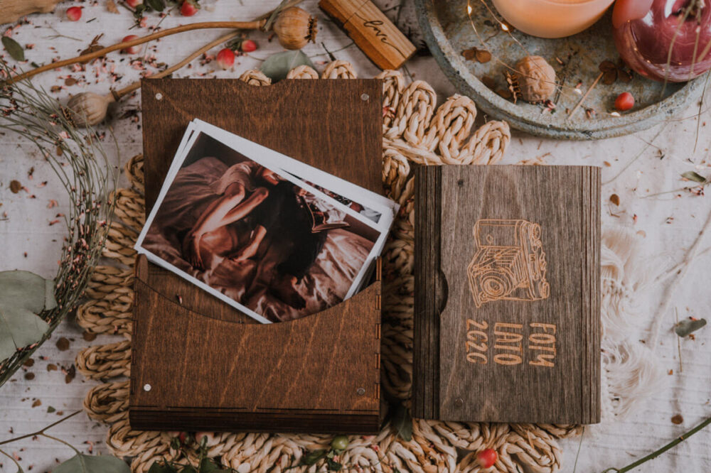 W cenę wlicza się: drewniane pudełko na fotografie i grawer laserowy na wieczku.