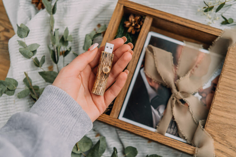 Drewniane pudełko na zdjęcia 15×23 cm z miejscem na pendrive