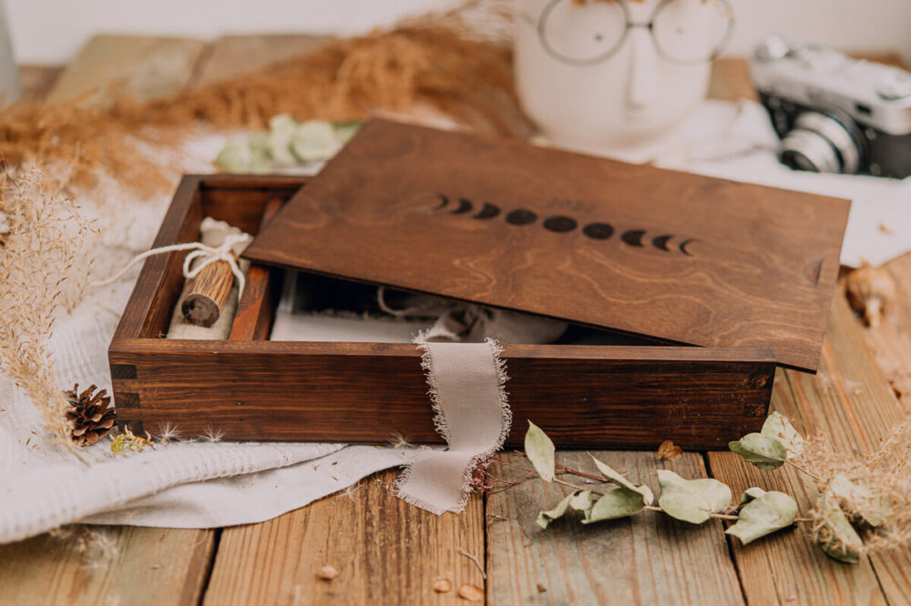 W cenę wlicza się: drewniane pudełko na fotografie, dodatkowa przegroda na USB, spersonalizowany grawer laserowy na zasuwce, boho wypełnienie – wkladka pod zdjęcia oraz poduszeczka na pendrive