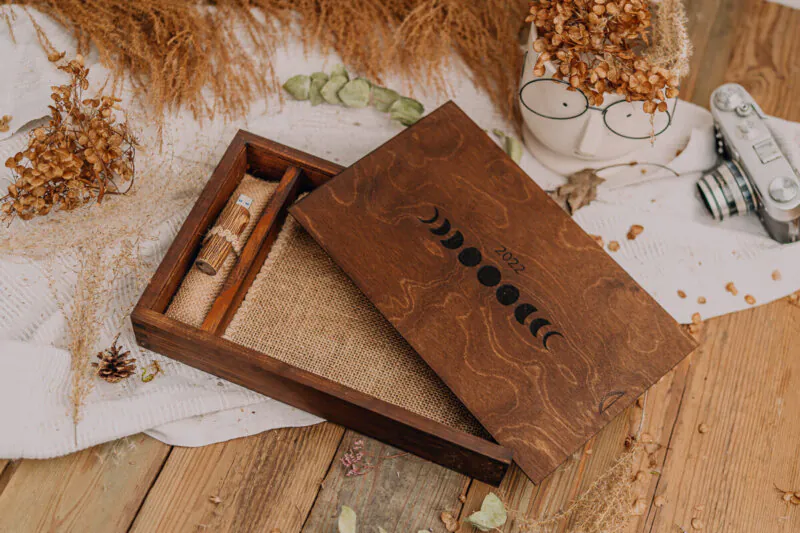 Jutowy szyk – klasa sama w sobie zachowana w personalizowanym, drewnianym pudełku na twoje fotografie. Idealna propozycja dla fanów stylu rustykalnego i boho, którzy cenią sobie jakość i trwałość.
