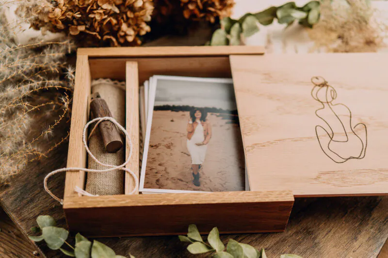 Pudełko dębowe na zdjęcia 10×15 cm z miejscem na USB – wypełnienie boho