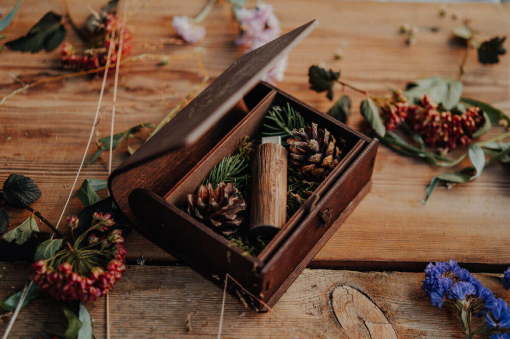 - pudełko wypełnione podłożem pachnącym lasem – mchem oraz gałązką iglastą i szyszką na wierzchu.