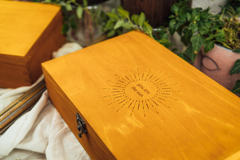 W cenę wlicza się: drewniane pudełko na zdjęcia, spersonalizowany grawer laserowy na zasuwce, malowanie.