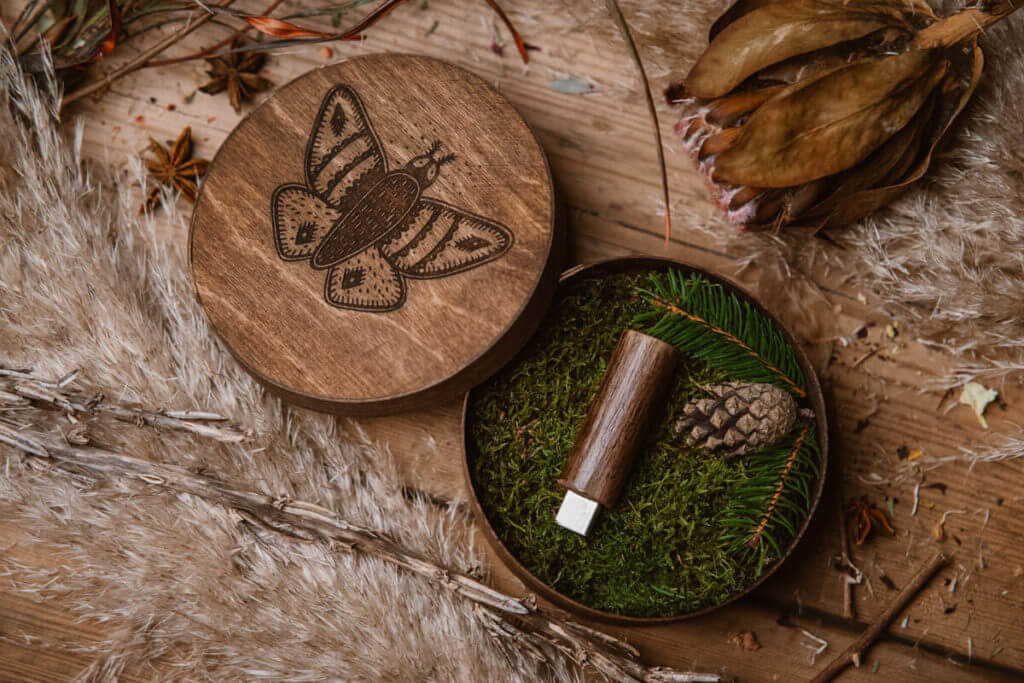 W cenę wlicza się: drewniane pudełko na USB, spersonalizowany grawer laserowy na zasuwce, leśne wypełnienie mech/szyszki, malowanie i zapach lasu.