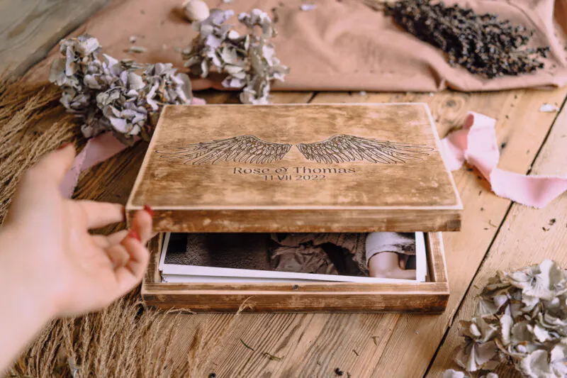 W cenę wlicza się: drewniane pudełko na zdjęcia, spersonalizowany grawer laserowy na zasuwce i malowanie.